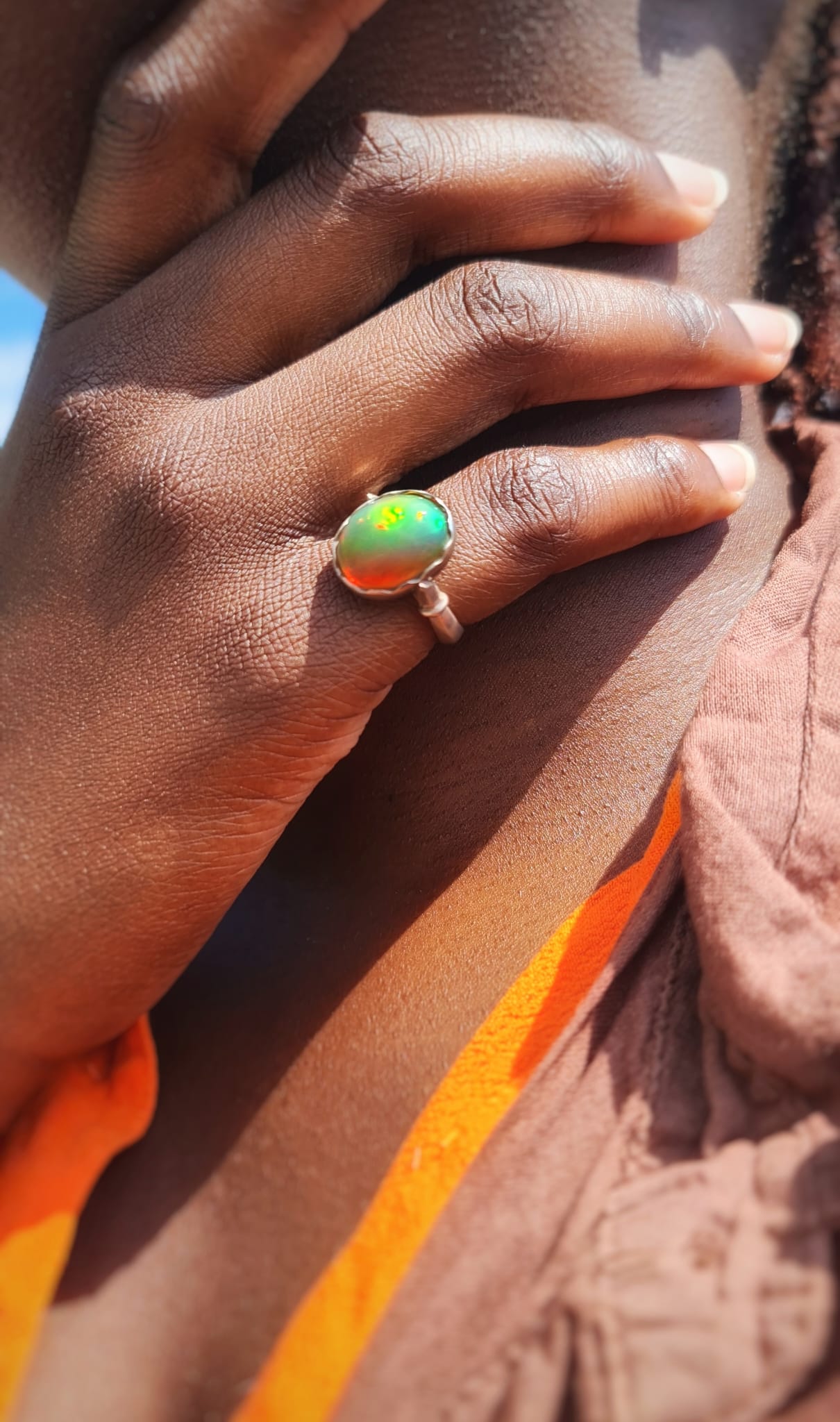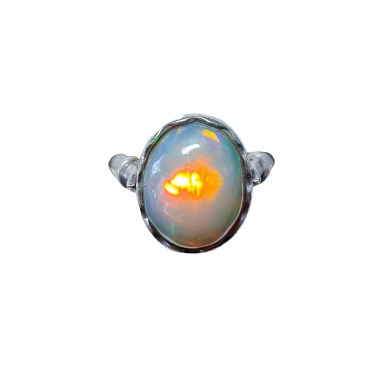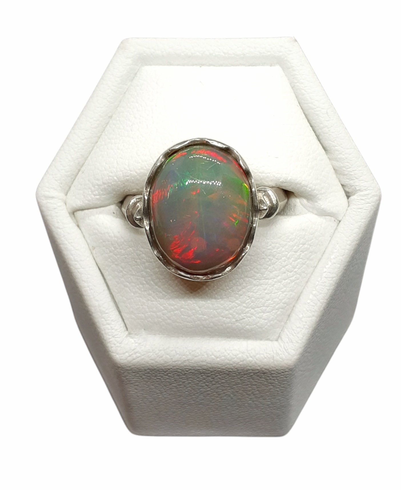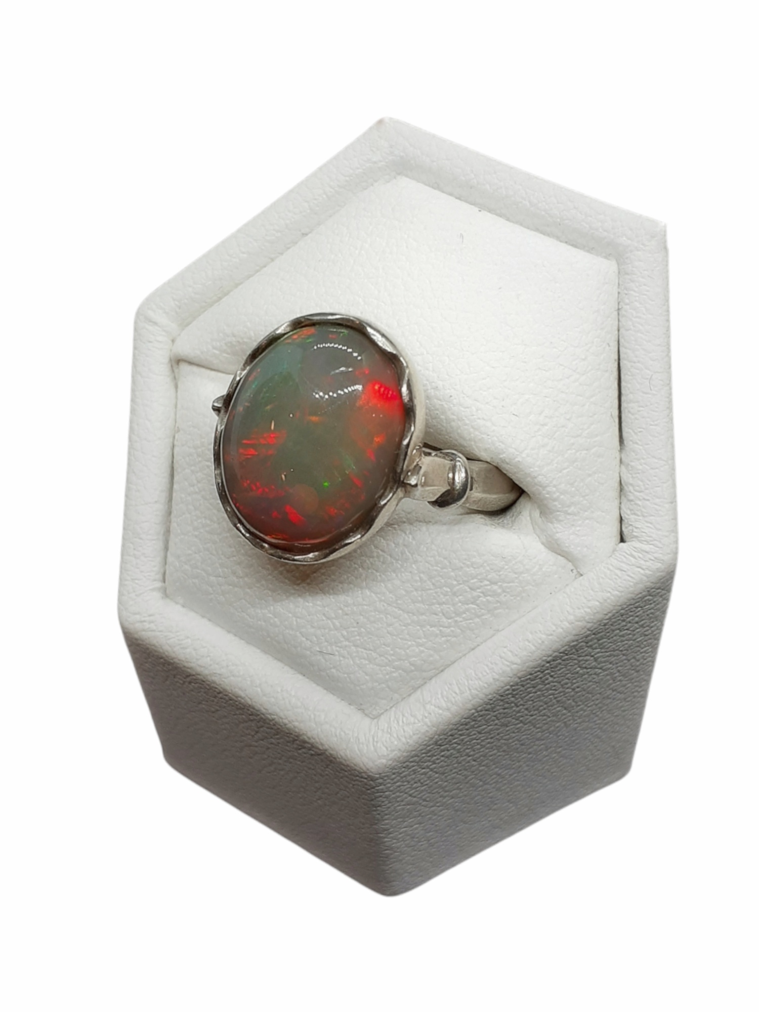Très belle et délicate bague en argent 925 sertie d’une incroyable opale cristal. Pierre en provenance d’ Ethiopie Carats : 4.9 Taille de la bague : 53
