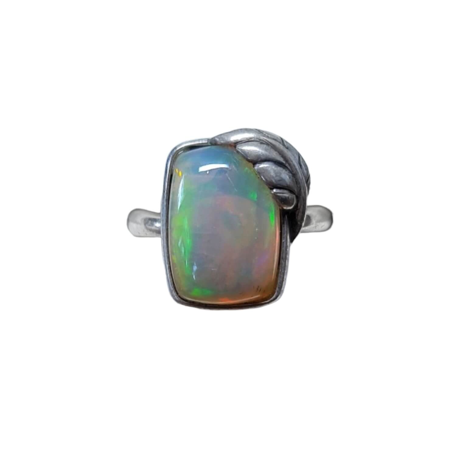 Design Raffiné : La bague, en argent 925, est méticuleusement entourée d’une feuille d’argent fine, ajoutant une touche de  nature. Ce détail délicat met en valeur l’opale cristal de manière élégante.