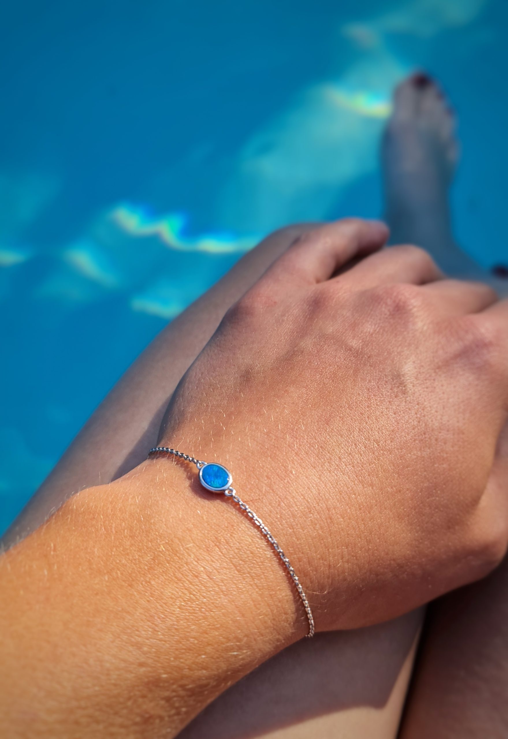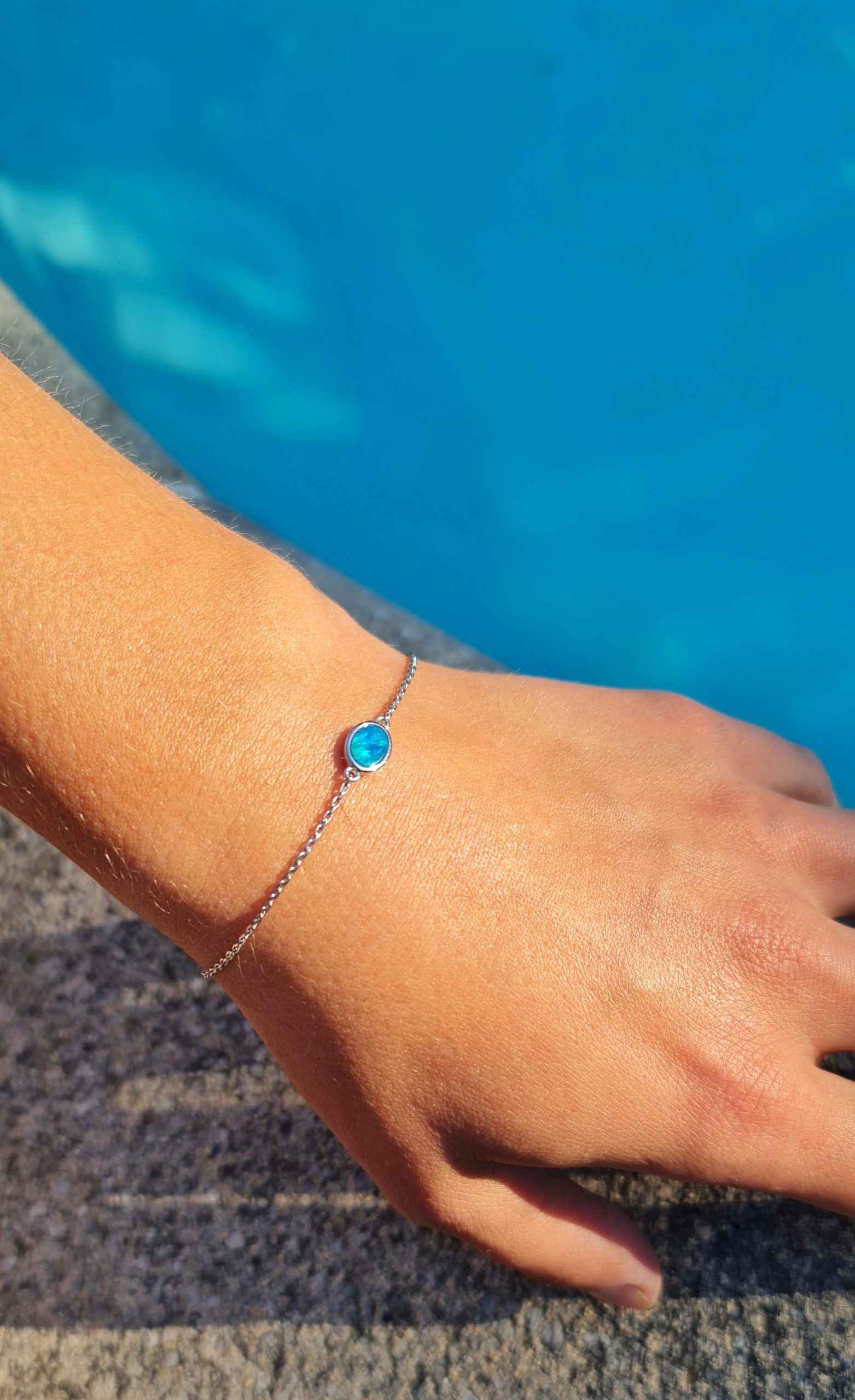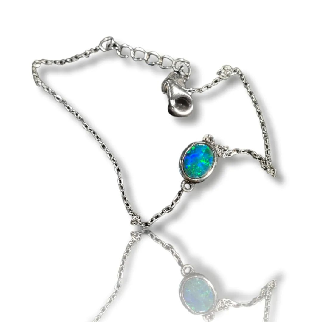 Ce bracelet en argent est orné d’une petite opale australienne, dont les reflets envoûtants varient du bleu profond au vert émeraude, créant un jeu de lumière fascinant.