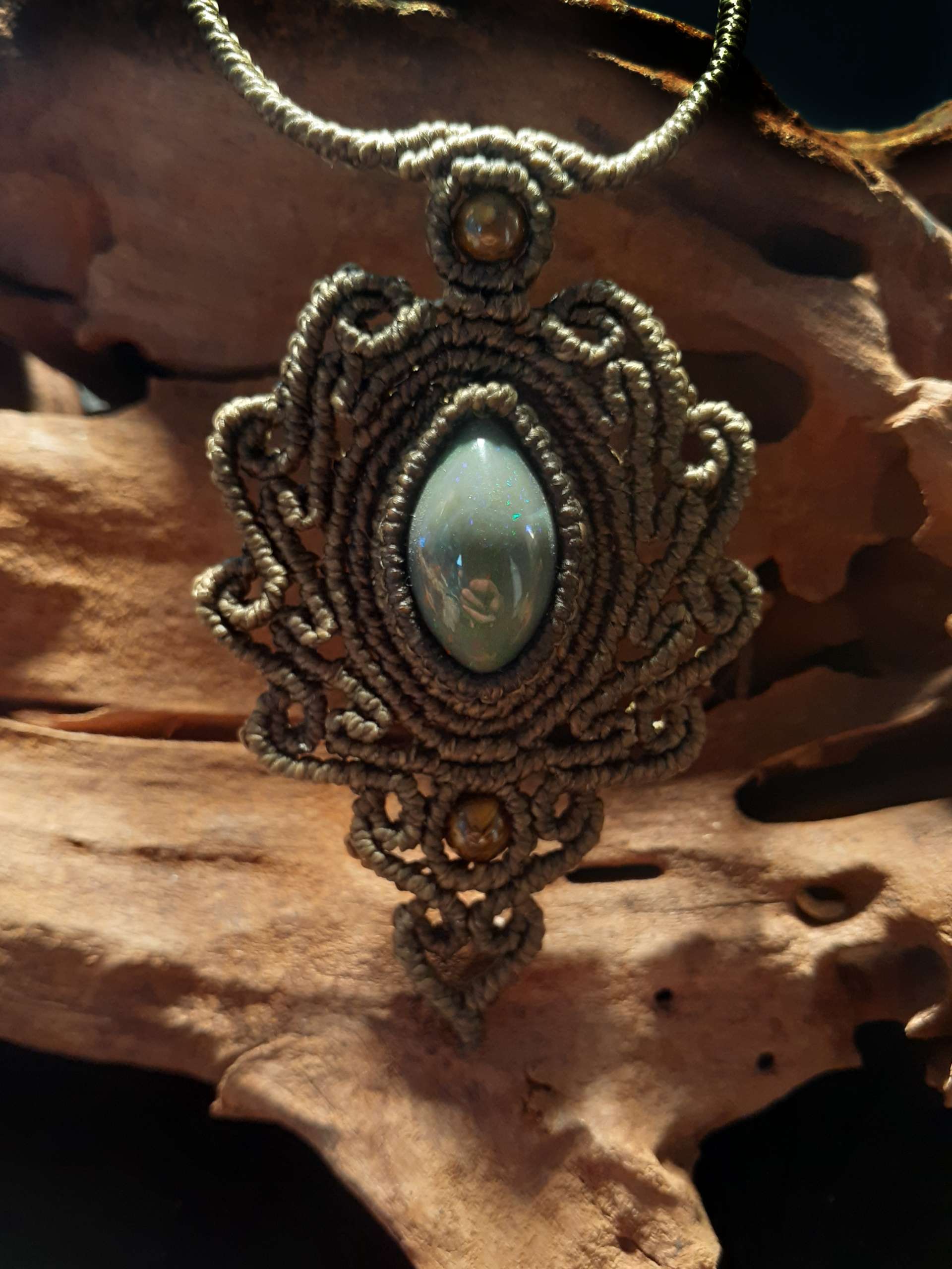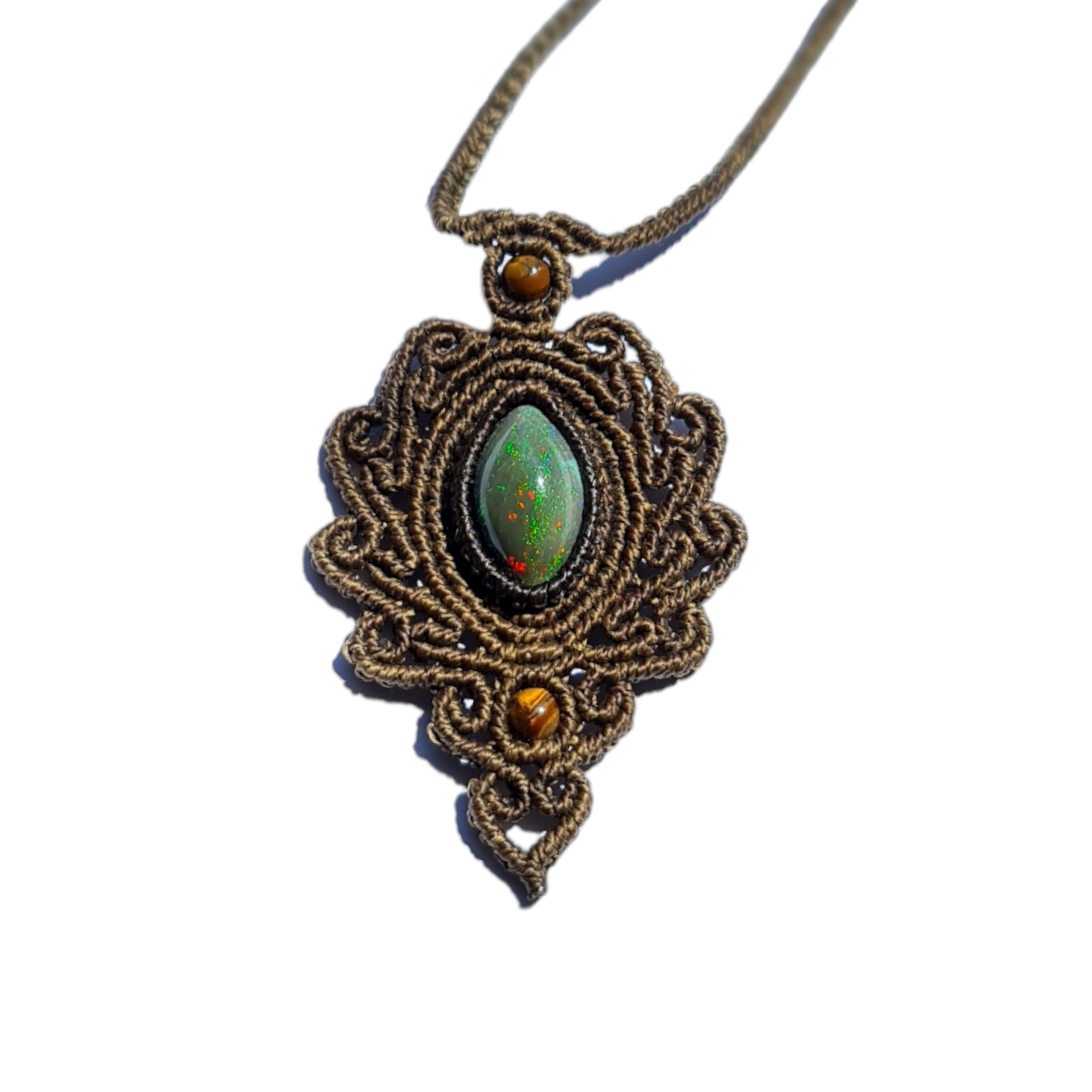 Découvrez notre somptueux collier en macramé, une pièce d’artisanat unique sertie d’une magnifique opale noire d’Éthiopie. Ce bijou exceptionnel allie l’élégance intemporelle du macramé à la beauté mystérieuse de l’opale noire, créant une harmonie parfaite entre tradition et modernité.