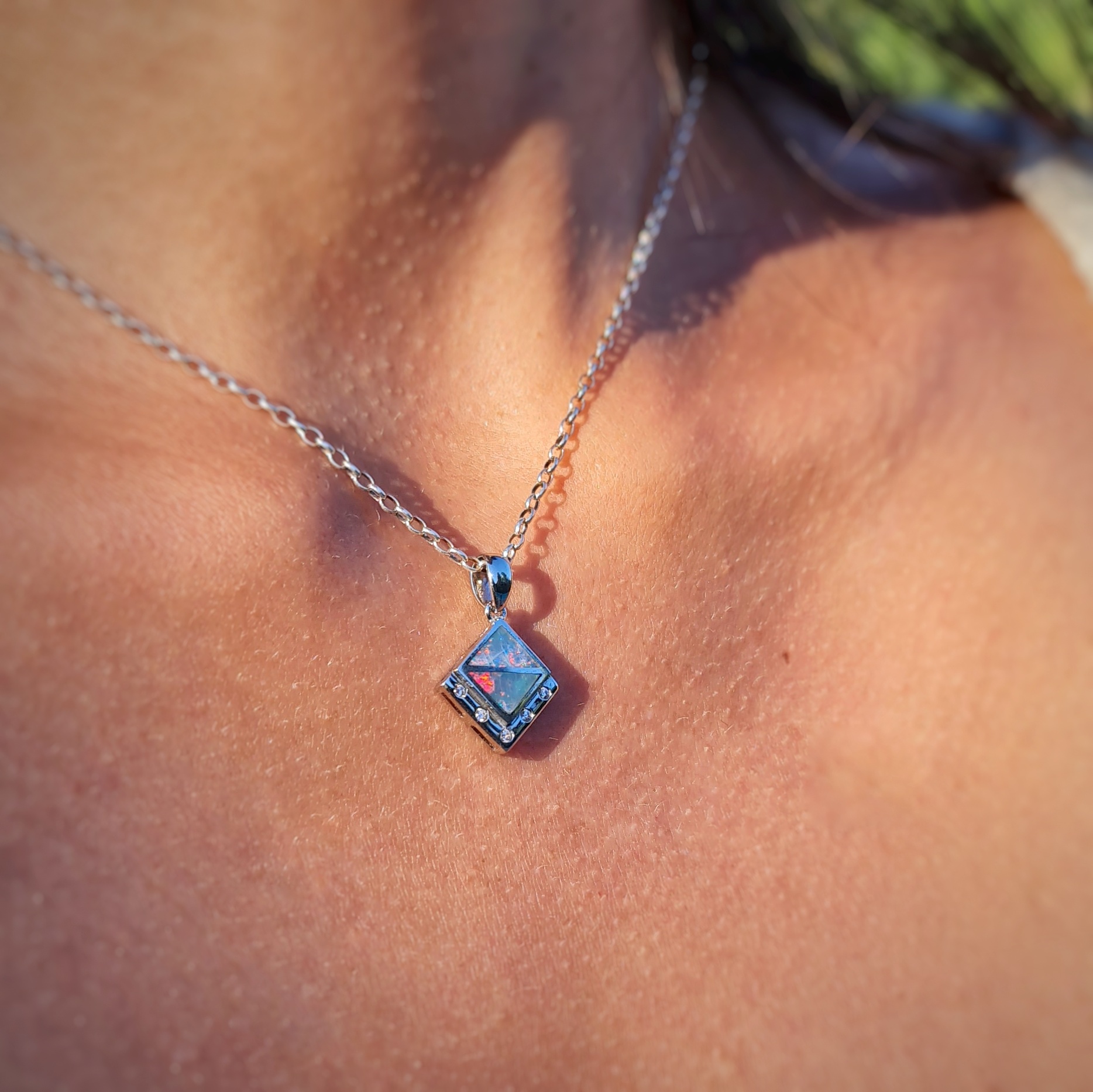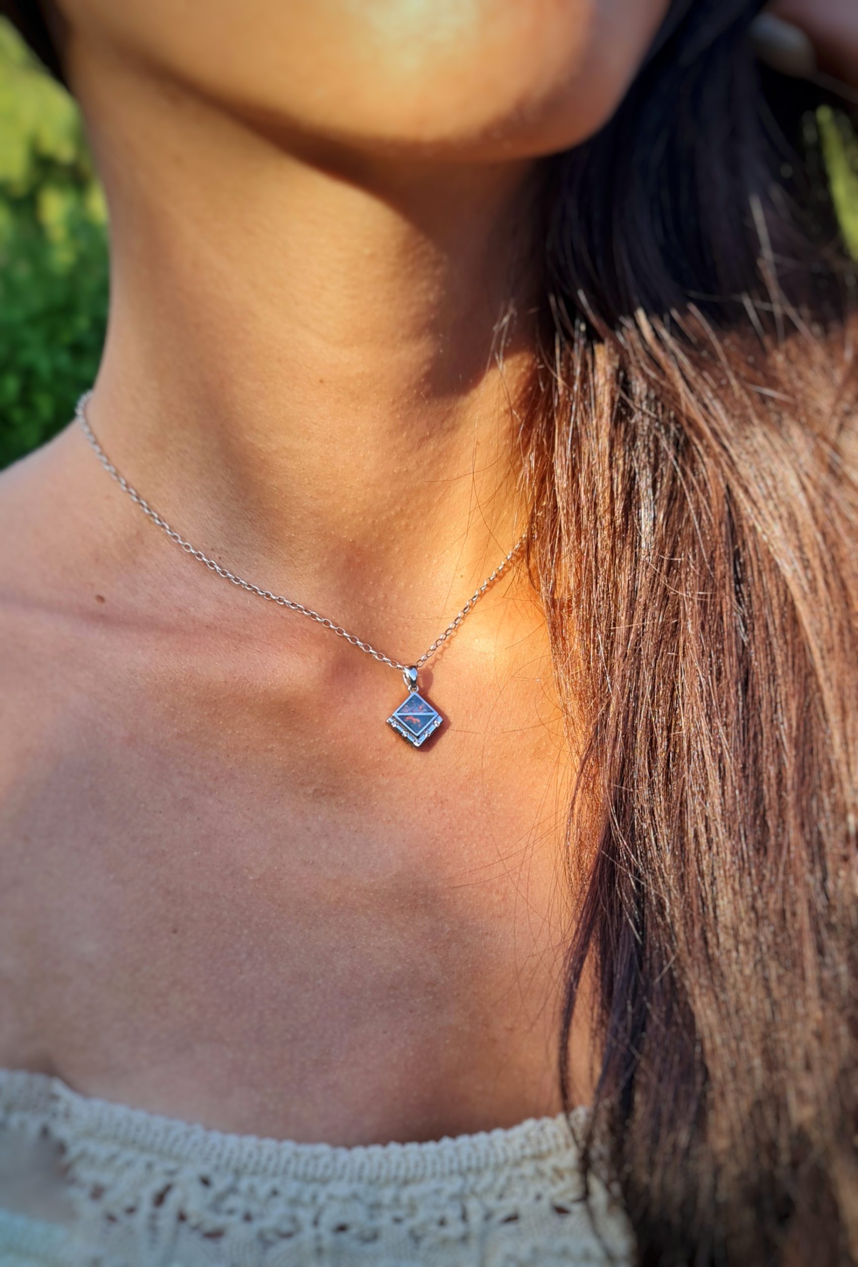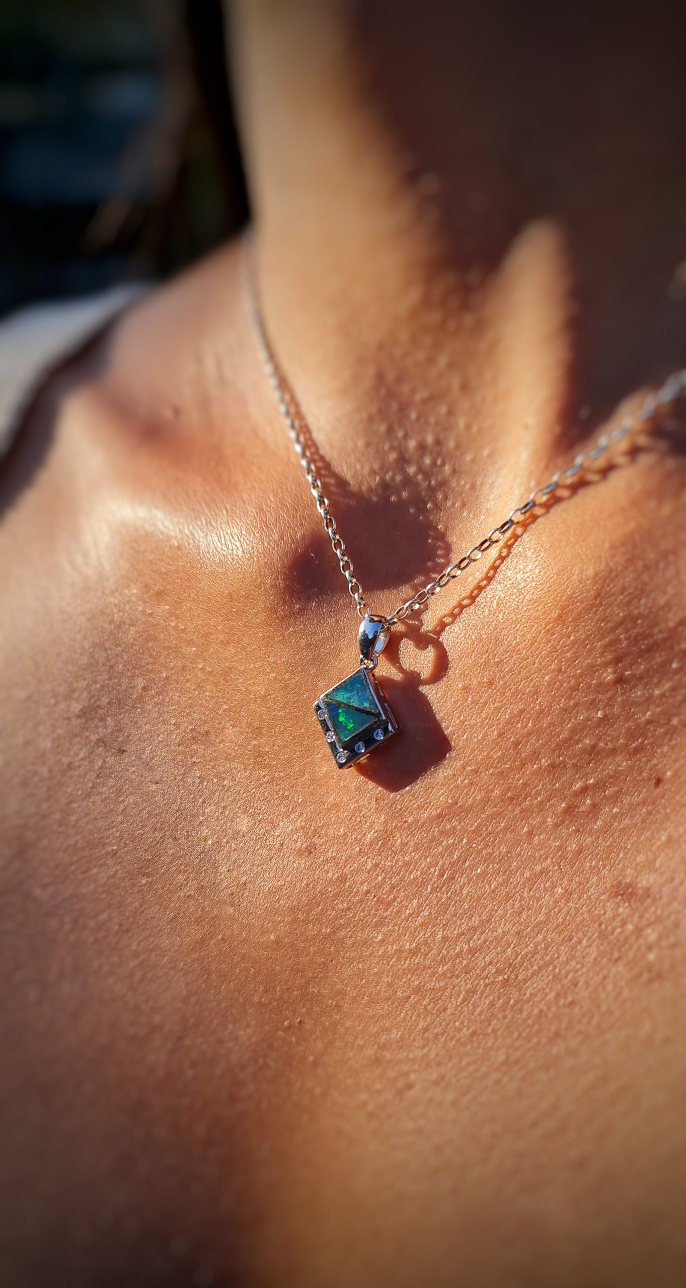 Découvrez l’élégance et la sophistication de notre pendentif carré en argent rhodié, orné d’une opale bleue d’Australie d’une beauté rare, et rehaussé de zircons étincelants. Ce bijou est une véritable œuvre d’art, idéale pour ajouter une touche raffinée à votre collection.